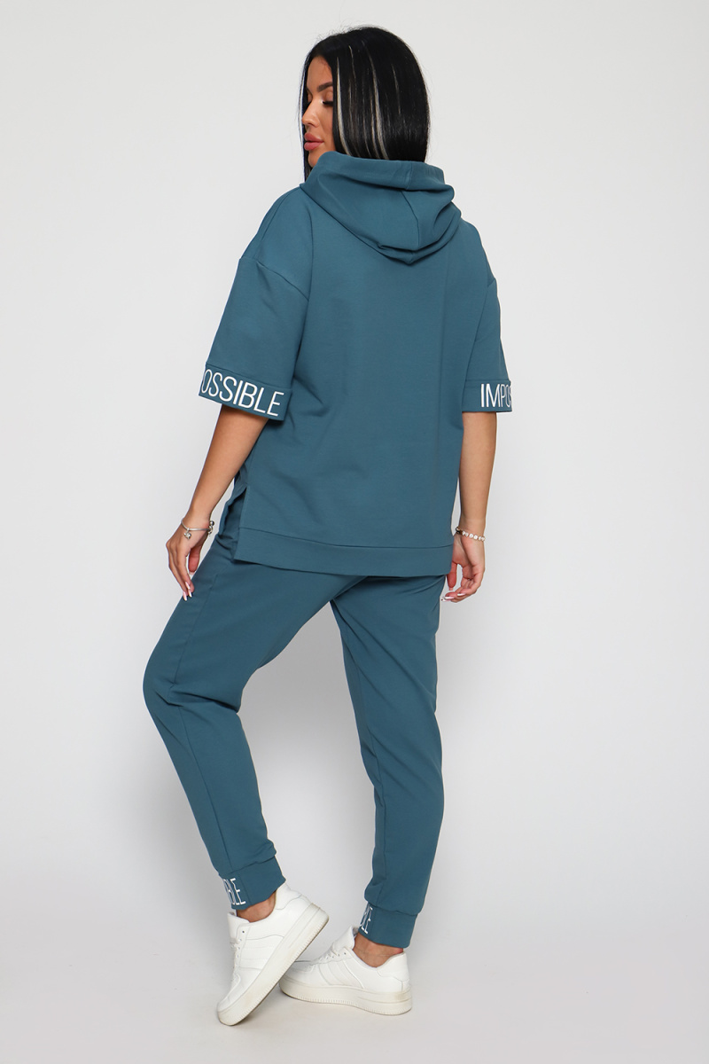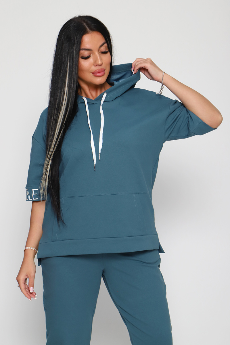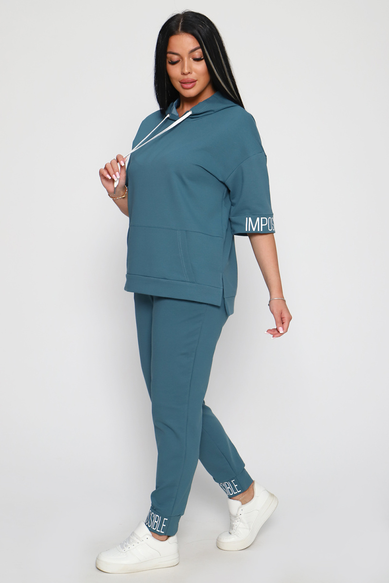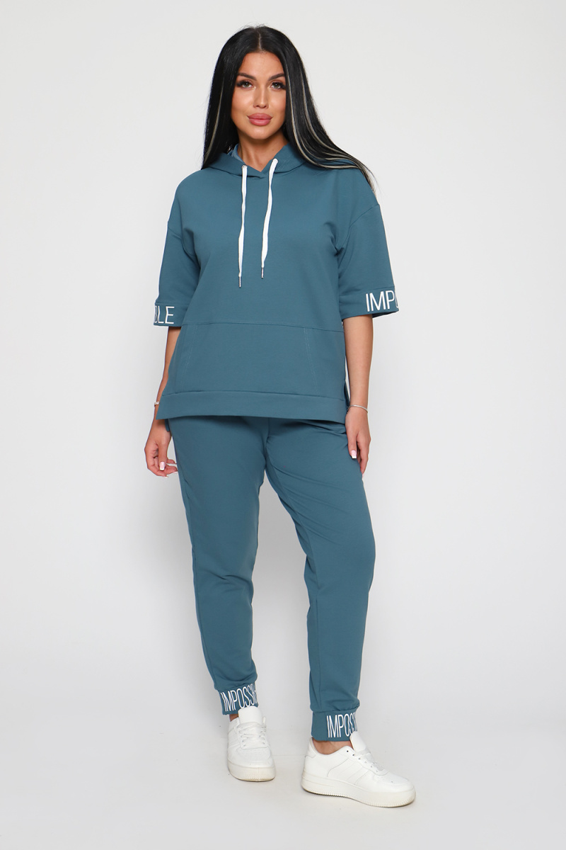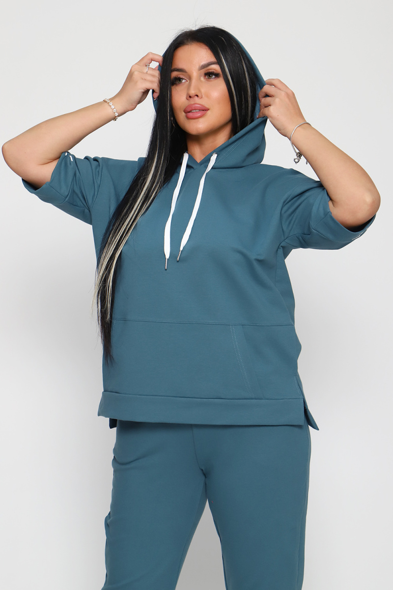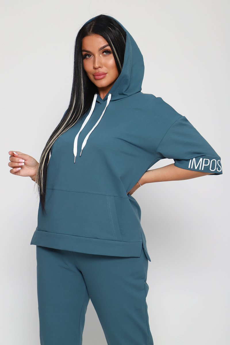Костюм женский их футера 2‑х нитки с лайкрой. Очень интересная модель, кофта удлинённая по бокам разрезы, рукава до локтя, на манжетах принт, карман кенгуру, брюки с карманами прямой посадки снизу на манжетах. На модели 48-50 размер.