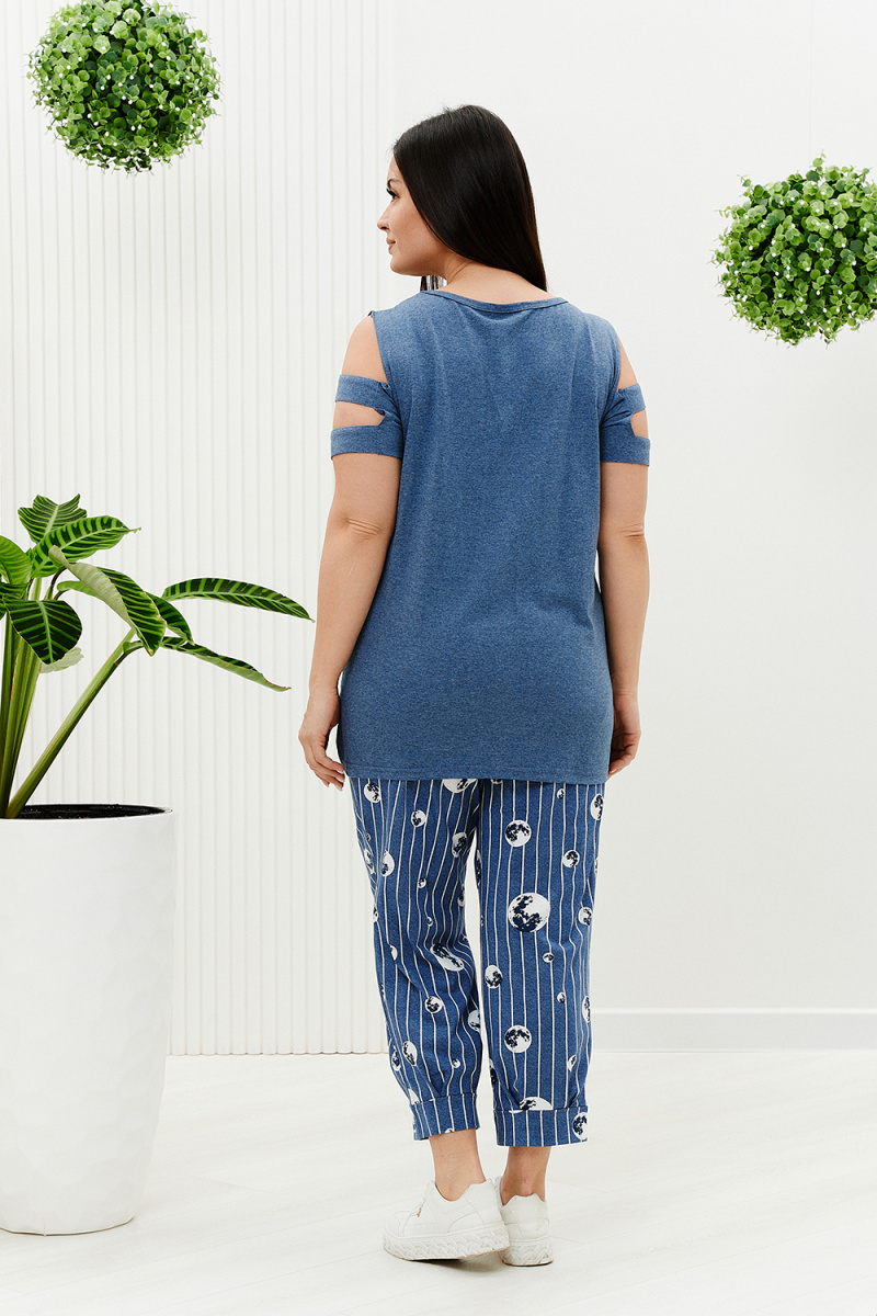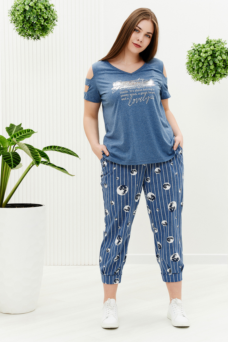 Костюм женский: туника и брюки. Туника прямого силуэта, вырез Y-образный. Полочка несколько короче спинки, сбоку разрезы. На полочке принт. Рукав не цельный, два хляста, расположенные через расстояние друг от друга, втачаны в боковые части рукава. Брюки свободные, "бананы", внизу передней и задней части по две встречные складки, манжеты. В брюках удобные внутренние карманы, пояс выполнен на многоигольной машине.