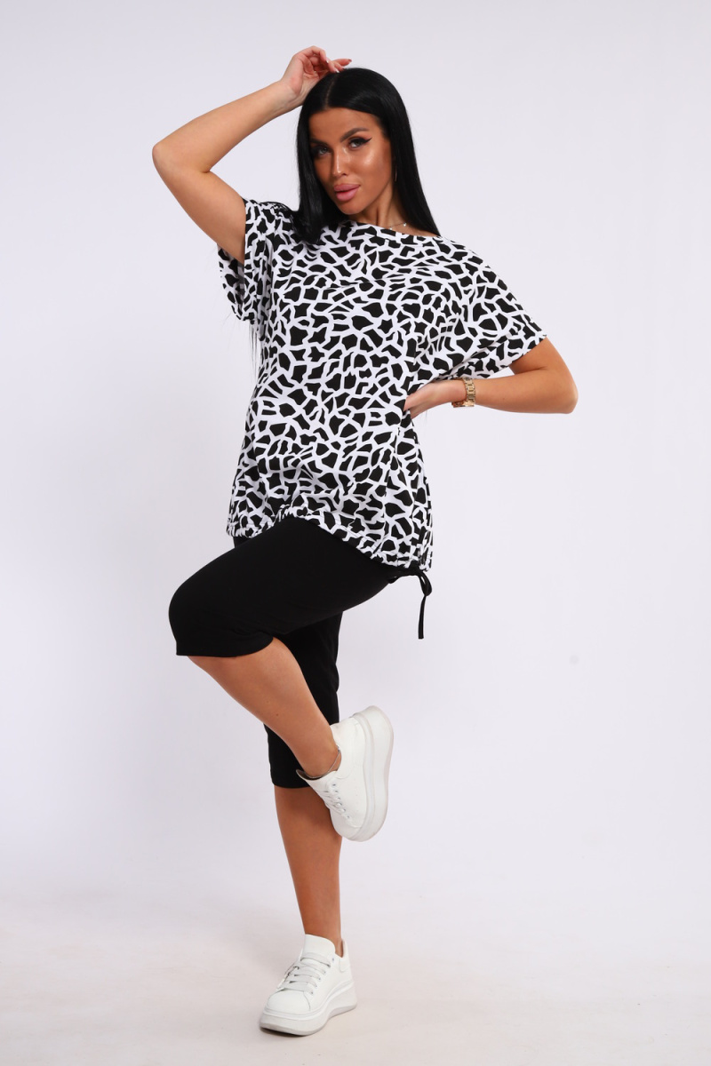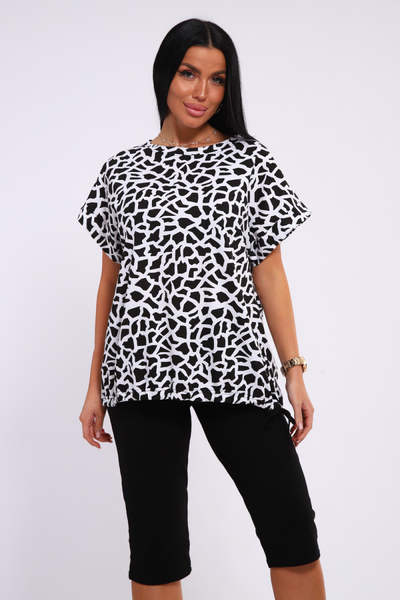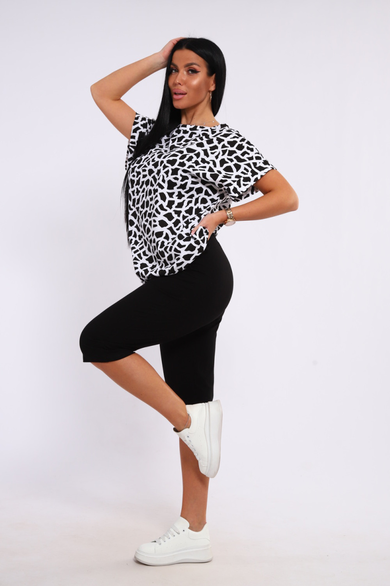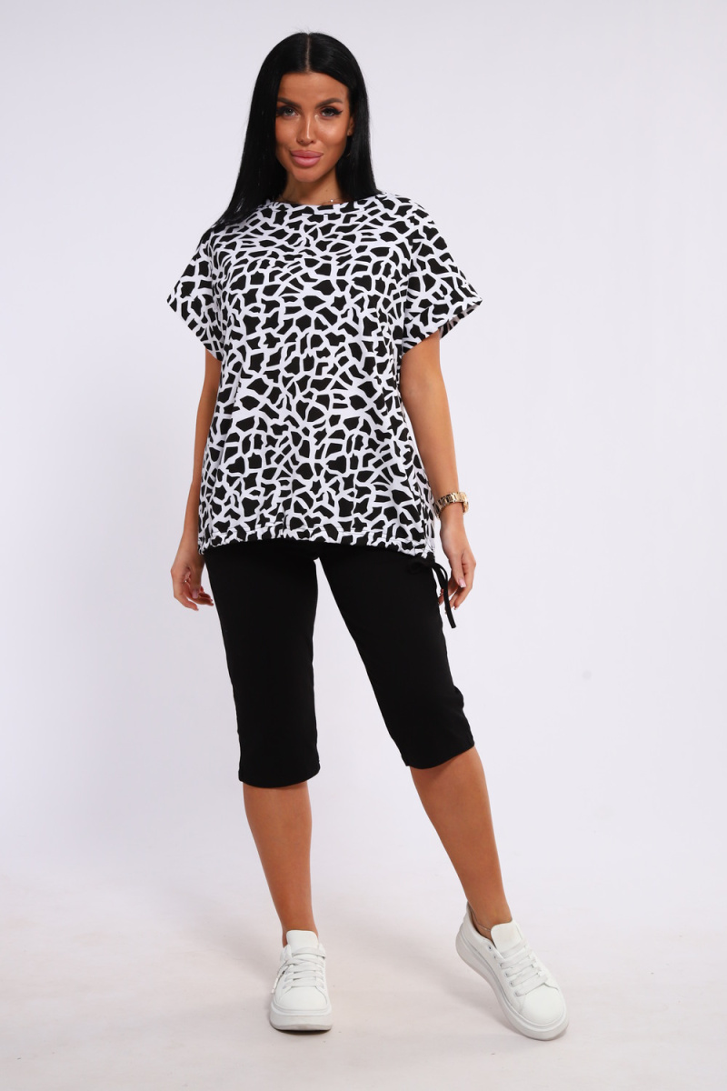 Костюм футболка и бриджи. Футболка свободного кроя, плечо спущенное с манжетом, низ на завязках. Бриджи на резинке