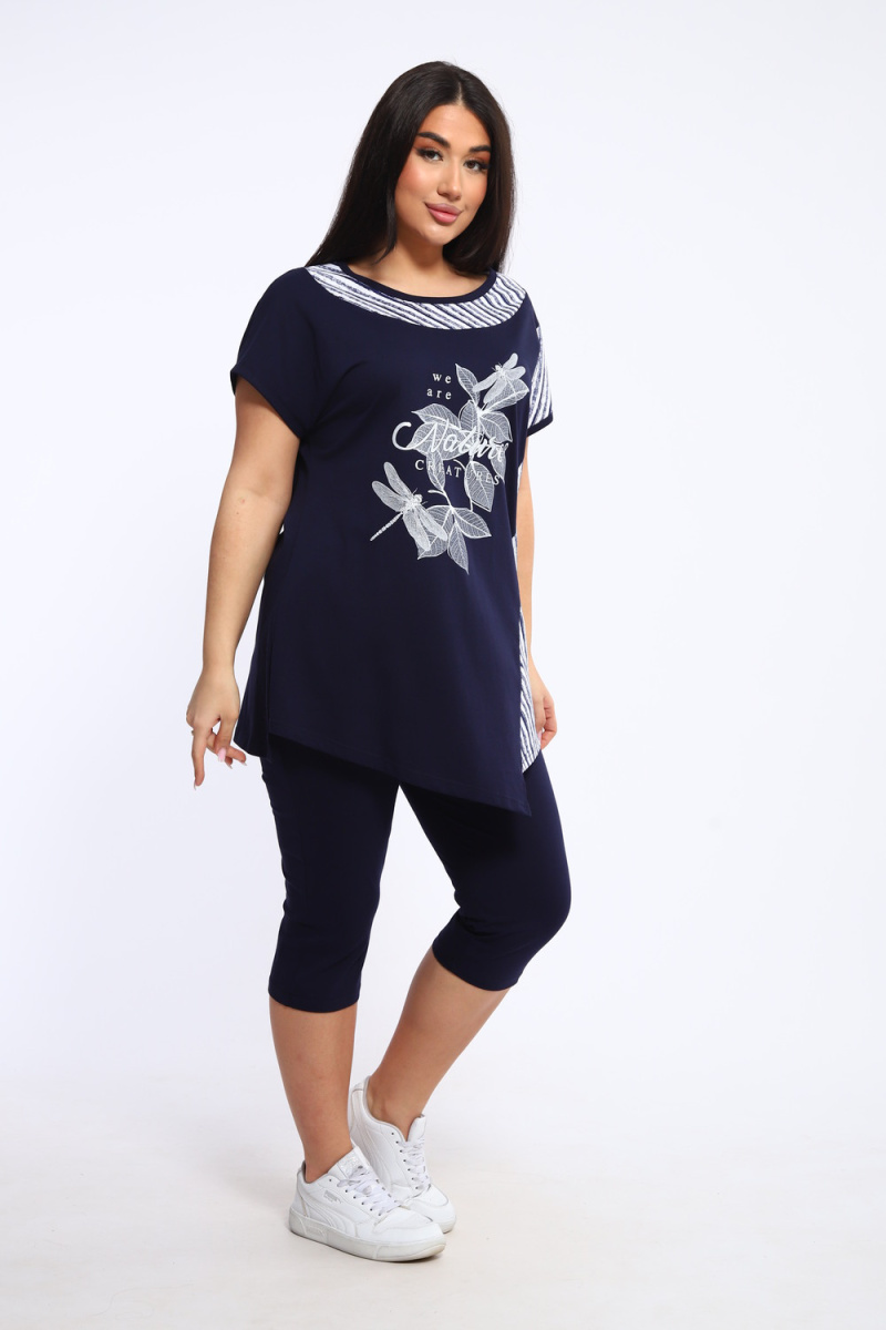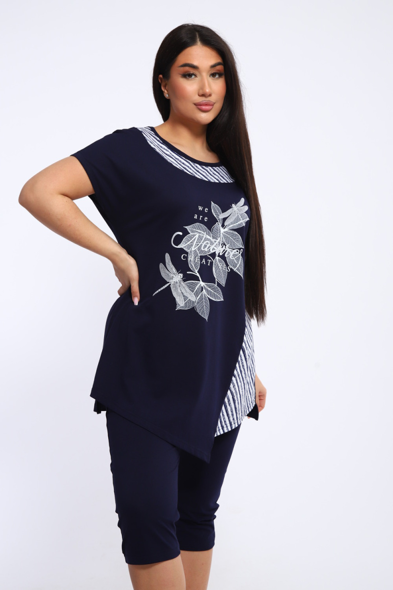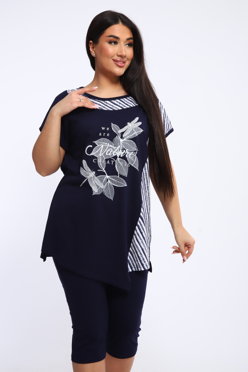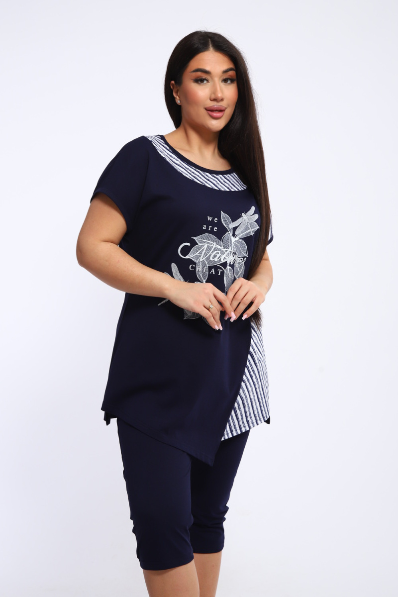 Костюм женский домашний ZIZAF имеет свободный покрой, что позволяет свободно двигаться и чувствовать себя комфортно. Рукава короткие, а вырез горловины круглый, что делает этот костюм еще более удобным для ношения дома.