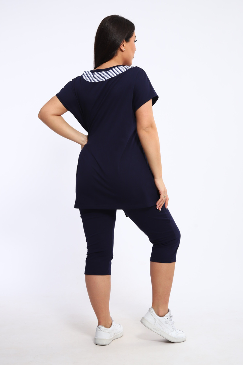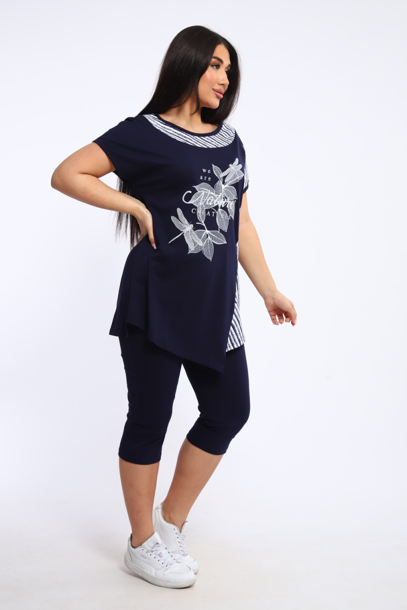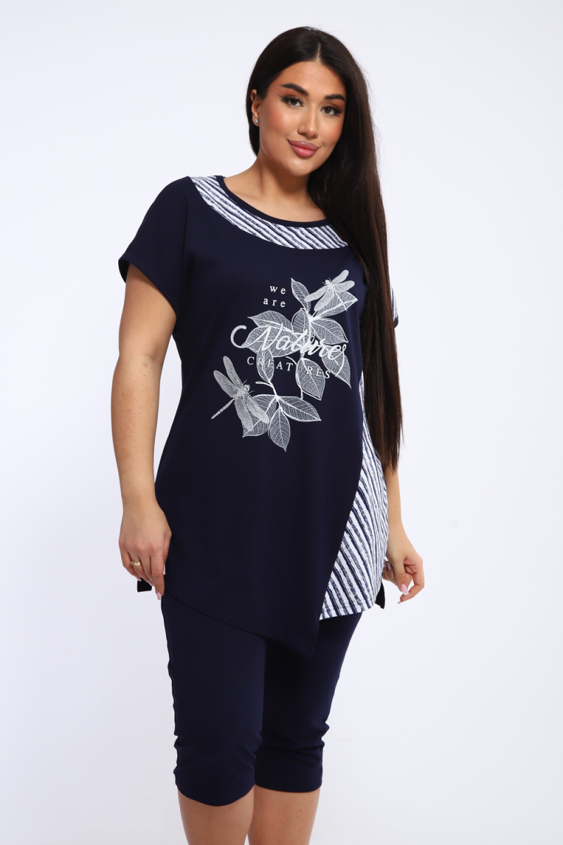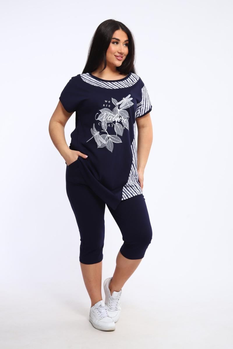 Костюм женский домашний ZIZAF имеет свободный покрой, что позволяет свободно двигаться и чувствовать себя комфортно. Рукава короткие, а вырез горловины круглый, что делает этот костюм еще более удобным для ношения дома.